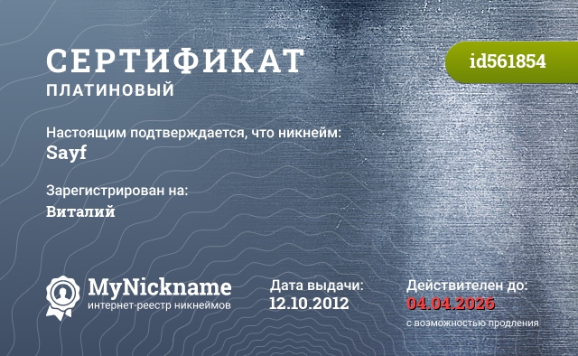 Nickname Sayf is registered to Vitaly. Issued certificate ID561854. Issue date 12.10.2012.