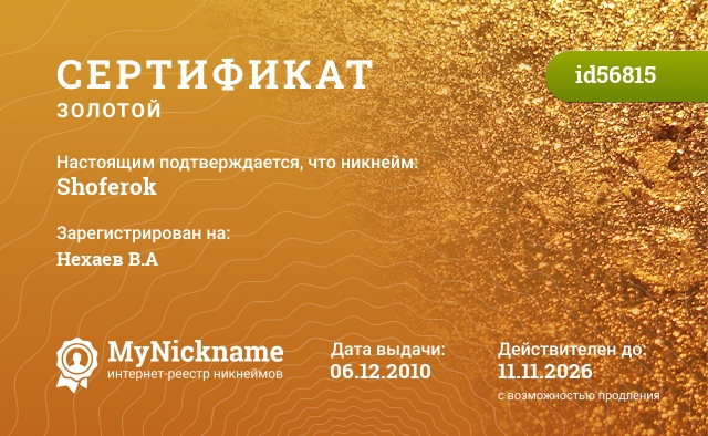 Nickname Shoferok is registered to Nekhaev V.A. Issued certificate ID56815. Issue date 06.12.2010.