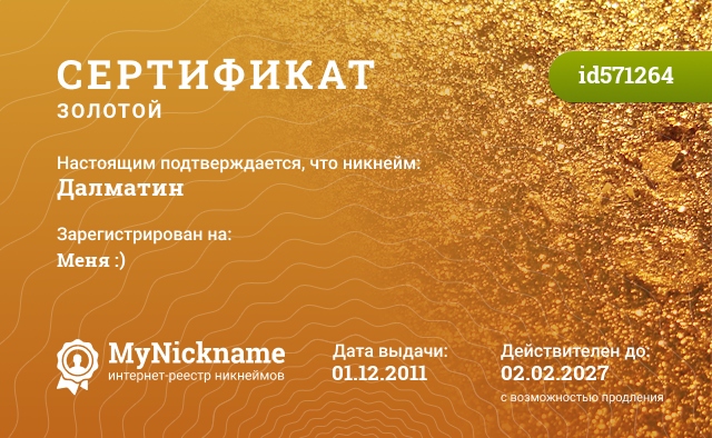 certificate for nickname: Далматин (id571264)