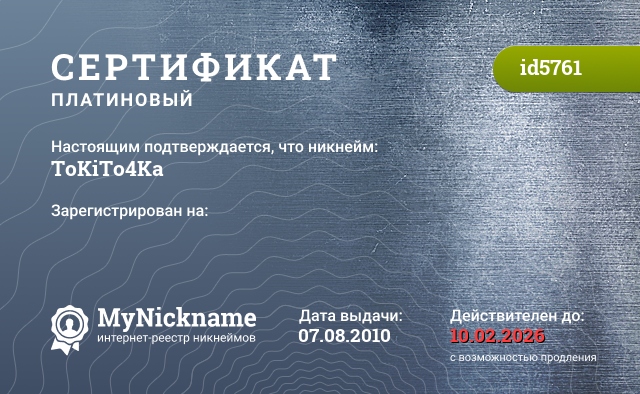 Nickname ToKiTo4Ka is registered to . Issued Platinum certificate ID5761. Issue date 07.08.2010.