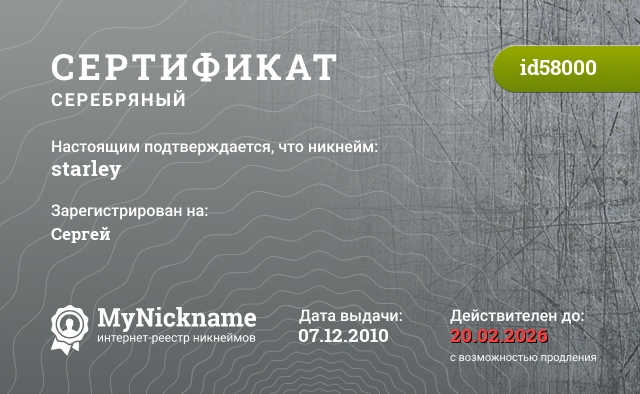 Nickname starley is registered to Sergey. Issued certificate ID58000. Issue date 07.12.2010.