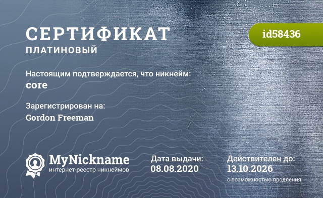 certificate for nickname: core (id58436)