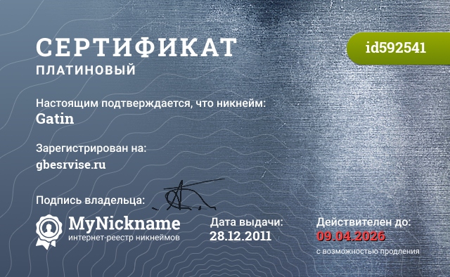 Nickname Gatin is registered to gbesrvise.ru. Issued certificate ID592541. Issue date 28.12.2011.