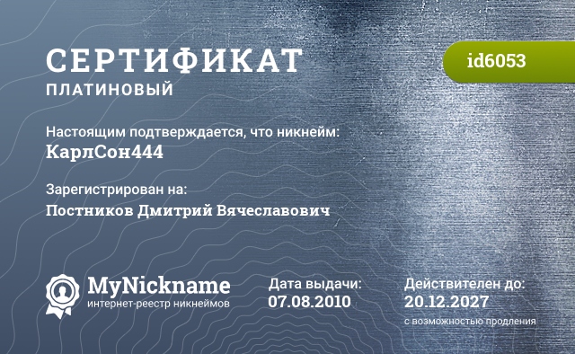 certificate for nickname: КарлСон444 (id6053)