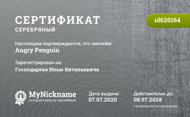 Nickname Angry Penguin is registered to Gospodarev Ilya Vitalievich. Issued certificate ID620164. Issue date 07.07.2020.