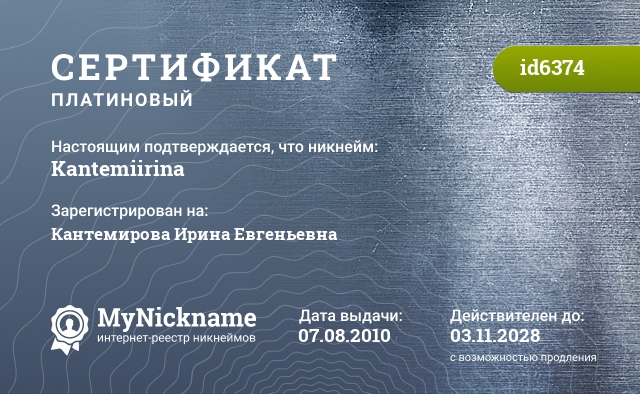 Nickname Kantemiirina is registered to Kantemirova Irina Evgenievna. Issued certificate ID6374. Issue date 07.08.2010.