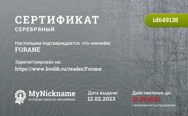 Сертификат на никнейм FORANE, зарегистрирован на https://www.livelib.ru/reader/Forane