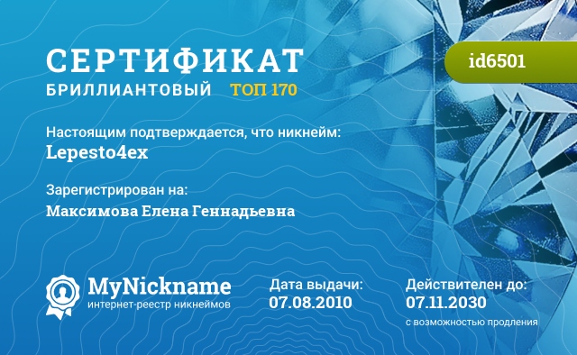 Nickname Lepesto4ex is registered to Maksimova Elena Gennadievna. Issued certificate ID6501. Issue date 07.08.2010.
