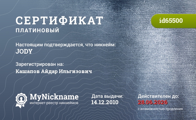 Nickname JODY is registered to Aidar Ilgizovich Kashapov. Issued certificate ID65500. Issue date 14.12.2010.