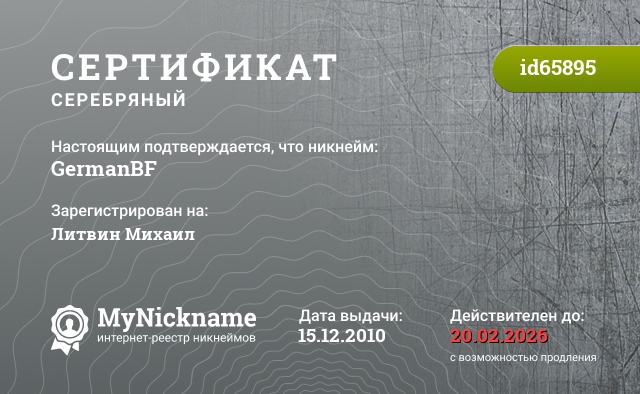 Nickname GermanBF is registered to Litvin Mikhail. Issued certificate ID65895. Issue date 15.12.2010.