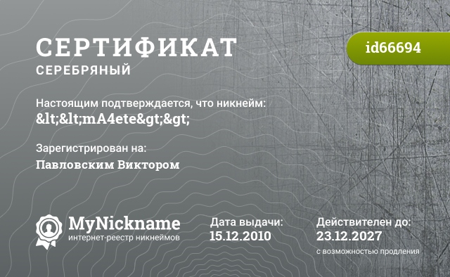 Никнейм <<mA4ete>> зарегистрирован на Павловским Виктором. Выдан сертификат id66694. Дата выдачи 15.12.2010.