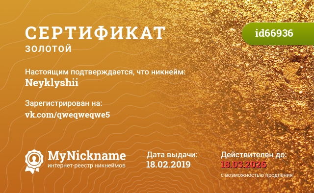 Nickname Neyklyshii is registered to vk.com/qweqweqwe5. Issued certificate ID66936. Issue date 18.02.2019.