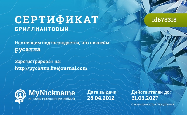 Nickname русалла is registered to http://rusalla.livejournal.com. Issued certificate ID678318. Issue date 28.04.2012.