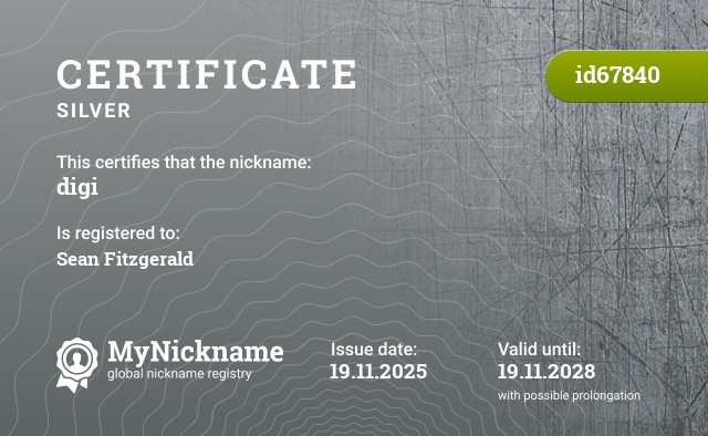 Nickname digi is registered to Sean Fitzgerald. Issued certificate ID67840. Issue date 19.11.2025.