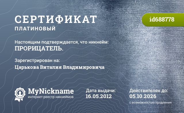 Nickname ПРОРИЦАТЕЛЬ. is registered to Vitaly Vladimirovich Tsarkov. Issued certificate ID688778. Issue date 16.05.2012.