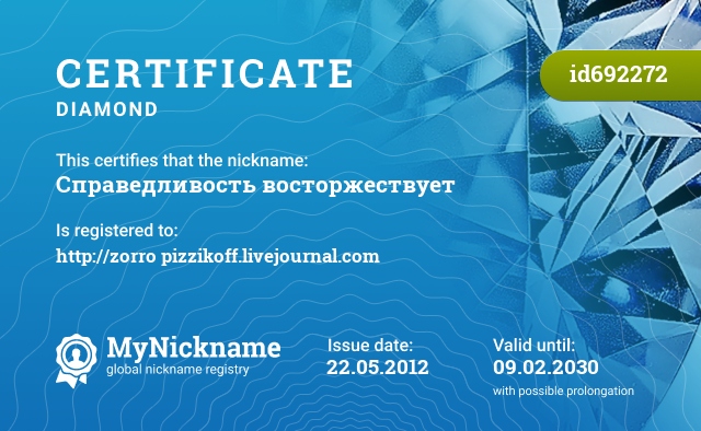 Nickname Справедливость восторжествует is registered to http://zorro pizzikoff.livejournal.com. Issued certificate ID692272. Issue date 22.05.2012.