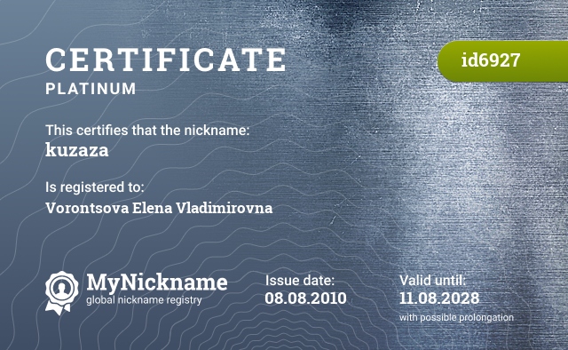 Nickname kuzaza is registered to Vorontsova Elena Vladimirovna. Issued certificate ID6927. Issue date 08.08.2010.
