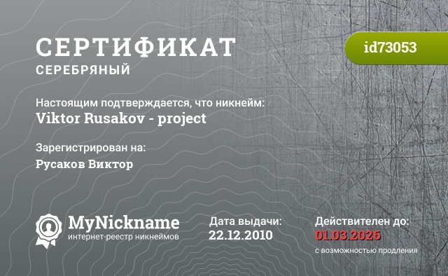 certificate for nickname: Viktor Rusakov - project (id73053)