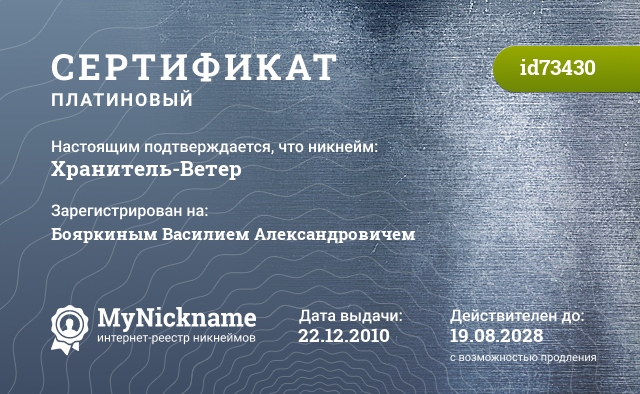 Nickname Хранитель-Ветер is registered to Boyarkin Vasily Alexandrovich. Issued certificate ID73430. Issue date 22.12.2010.