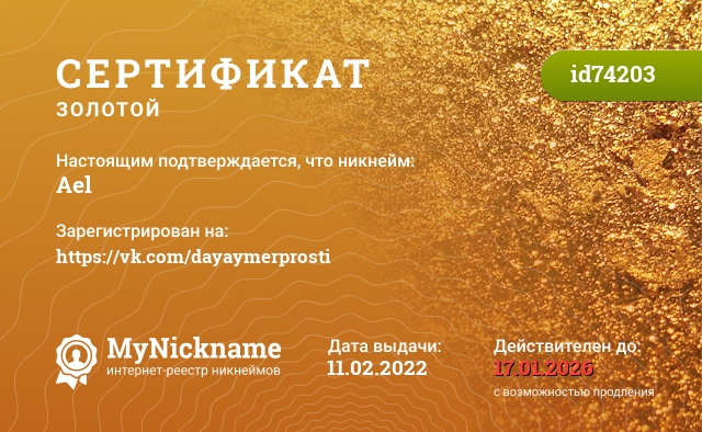 Никнейм Ael зарегистрирован на https://vk.com/dayaymerprosti. Выдан сертификат id74203. Дата выдачи 11.02.2022.
