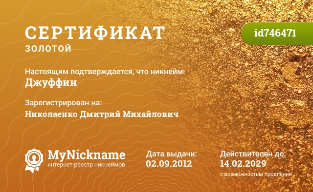 Nickname Джуффин is registered to Nikolaenko Dmitry Mikhailovich. Issued certificate ID746471. Issue date 02.09.2012.