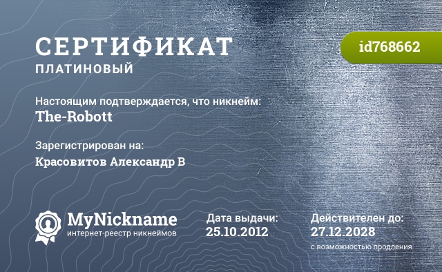 Nickname The-Robott is registered to Krasovitov Alexander V. Issued certificate ID768662. Issue date 25.10.2012.