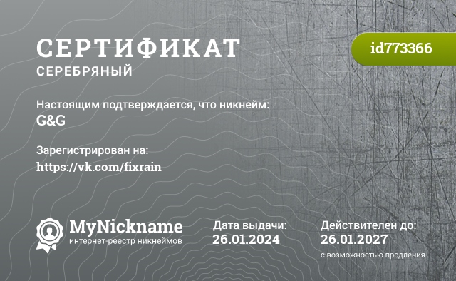 Nickname G&G is registered to https://vk.com/fixrain. Issued certificate ID773366. Issue date 26.01.2024.