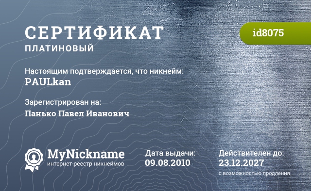 Nickname PAULkan is registered to Panko Pavel Ivanovich. Issued certificate ID8075. Issue date 09.08.2010.