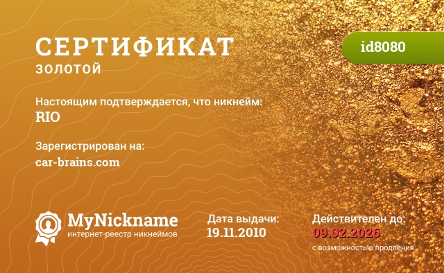 Никнейм RIO зарегистрирован на car-brains.com. Выдан сертификат id8080. Дата выдачи 19.11.2010.