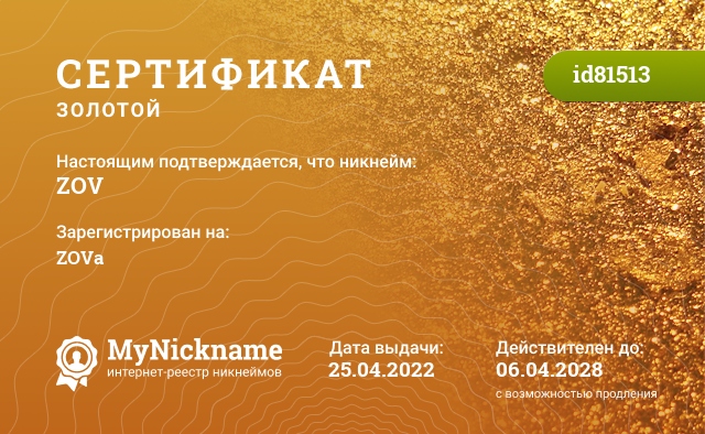 Никнейм ZOV зарегистрирован на ZOVa. Выдан сертификат id81513. Дата выдачи 25.04.2022.