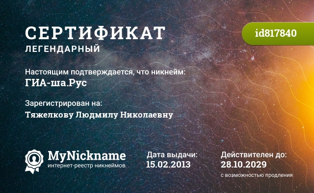 Nickname ГИА-ша.Рус is registered to Тяжелкову Людмилу Николаевну. Issued certificate ID817840. Issue date 15.02.2013.