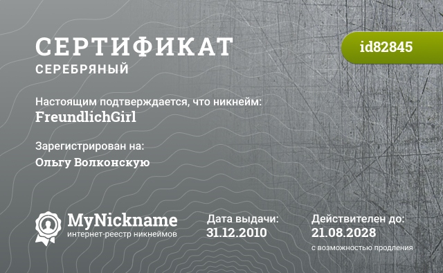 Nickname FreundlichGirl is registered to Olga Volkonskaya. Issued Silver certificate ID82845. Issue date 31.12.2010.