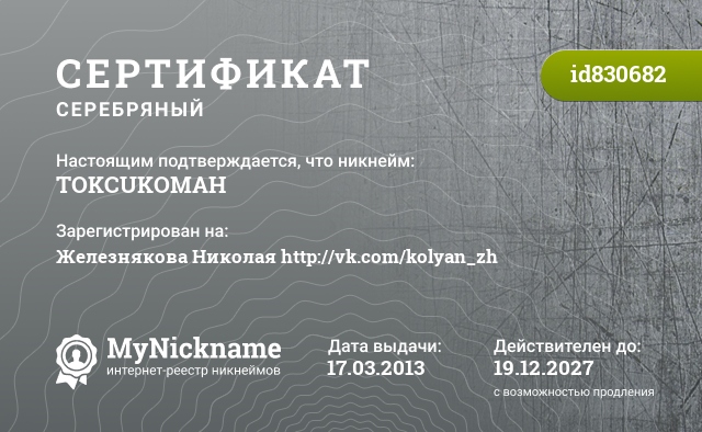 Nickname TOKCUKOMAH is registered to Zheleznyakov Nikolay http://vk.com/kolyan_zh. Issued certificate ID830682. Issue date 17.03.2013.