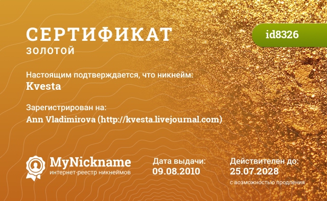 Никнейм Kvesta зарегистрирован на Ann Vladimirova (http://kvesta.livejournal.com). Выдан сертификат id8326. Дата выдачи 09.08.2010.