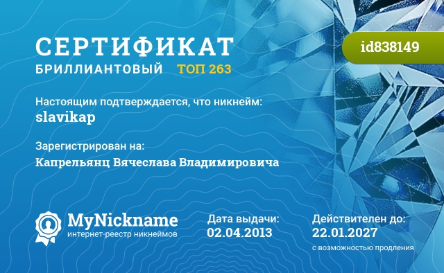 Nickname slavikap is registered to Kaprelyants Vyacheslav Vladimirovich. Issued certificate ID838149. Issue date 02.04.2013.
