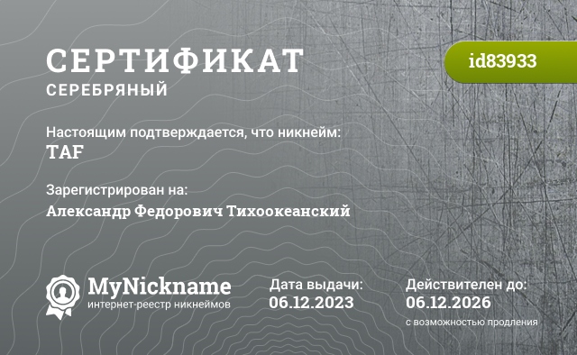 Nickname TAF is registered to Alexander Fedorovich Pacific. Issued certificate ID83933. Issue date 06.12.2023.