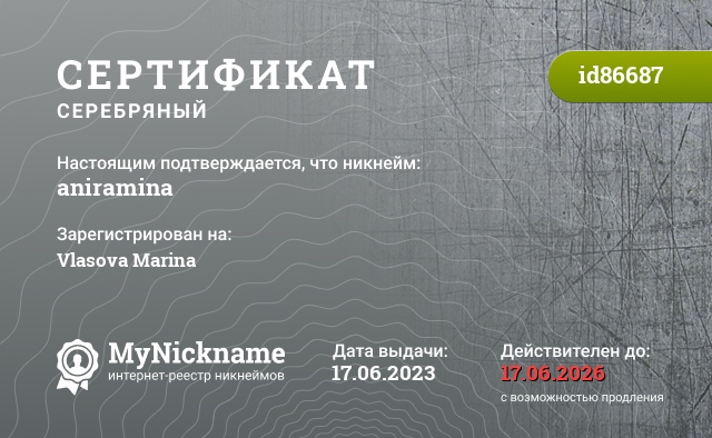 Nickname aniramina is registered to Vlasova Marina. Issued certificate ID86687. Issue date 17.06.2023.