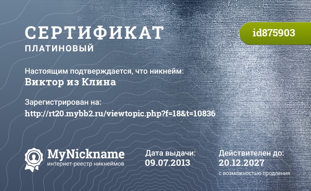 Nickname Виктор из Клина is registered to http://rt20.mybb2.ru/viewtopic.php?f=18&t=10836. Issued certificate ID875903. Issue date 09.07.2013.