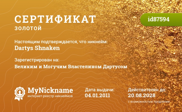 Nickname Dartys Shnaken is registered to The Great and Mighty Lord Dartus. Issued certificate ID87594. Issue date 04.01.2011.