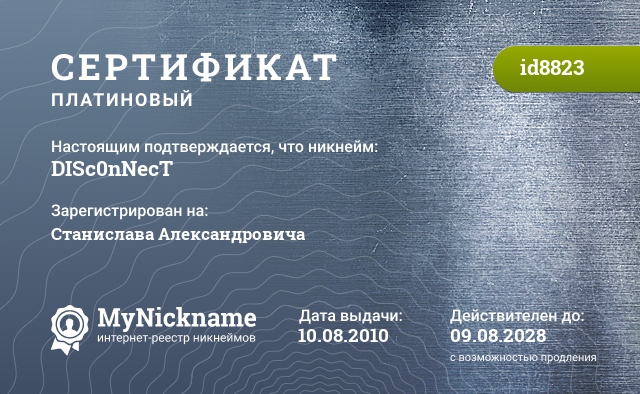 Nickname DISc0nNecT is registered to Stanislav Alexandrovich. Issued certificate ID8823. Issue date 10.08.2010.