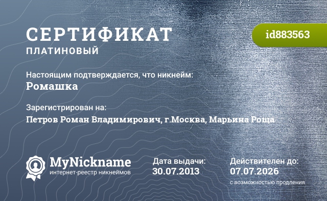 Никнейм Рoмашка зарегистрирован на Петров Роман Владимирович, г.Москва, Марьина Роща. Выдан платиновый сертификат id883563. Дата выдачи 30.07.2013.