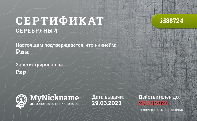 Никнейм Рин зарегистрирован на Рир. Выдан сертификат id88724. Дата выдачи 29.03.2023.