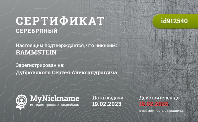 Nickname RAMMSTEIN is registered to Dubrovsky Sergey Alexandrovich. Issued Gold certificate ID912540. Issue date 19.02.2023.