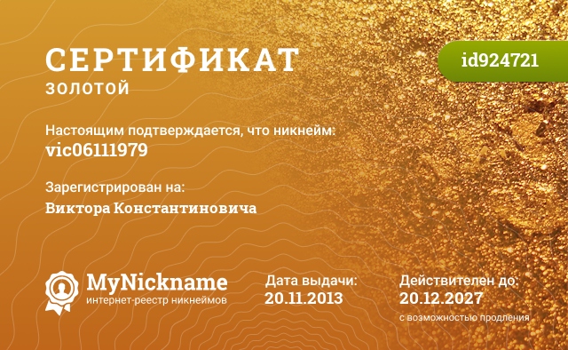 Никнейм vic06111979 зарегистрирован на Виктора Константиновича. Выдан сертификат id924721. Дата выдачи 20.11.2013.