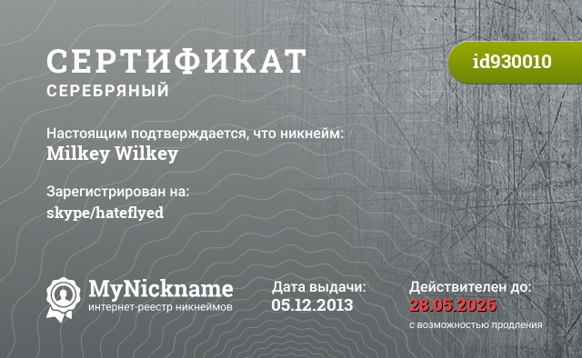 Никнейм Milkey Wilkey зарегистрирован на skype/hateflyed. Выдан сертификат id930010. Дата выдачи 05.12.2013.