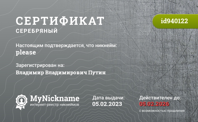 Nickname please is registered to Vladimir Vladimirovich Putin. Issued Silver certificate ID940122. Issue date 05.02.2023.