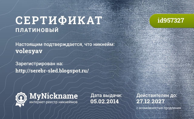 Nickname volesyav is registered to http://serebr-sled.blogspot.ru/. Issued certificate ID957327. Issue date 05.02.2014.