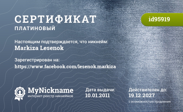 Никнейм Markiza Lesenok зарегистрирован на https://www.facebook.com/lesenok.markiza. Выдан сертификат id95919. Дата выдачи 10.01.2011.