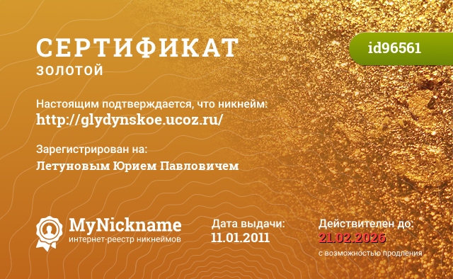 certificate for nickname: http://glydynskoe.ucoz.ru/ (id96561)