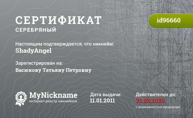 Никнейм ShadyAngel зарегистрирован на Васюкову Татьяну Петровну. Выдан сертификат id96660. Дата выдачи 11.01.2011.